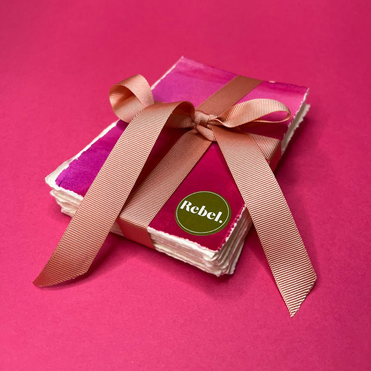 Available in A7, using beautiful hand-deckled white cartridge paper, and finished with handpainted endpapers and a classic Rebel Peach grosgrain ribbon, these little bundles of creativity make a beautiful, affordable gift.